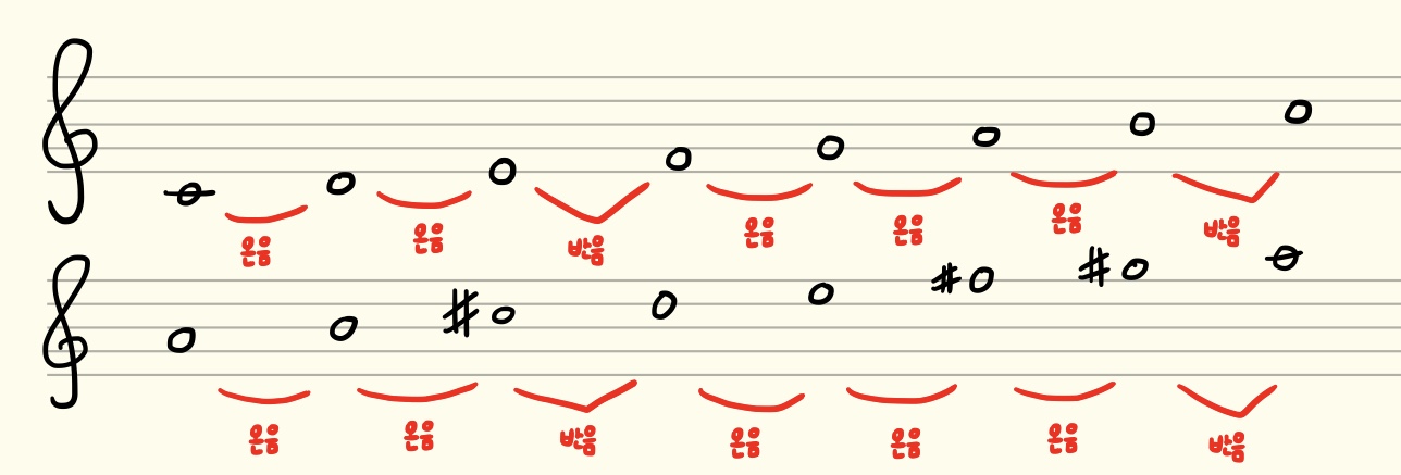 예를 들어 다장조 음계(C Major Scale)의 경우와 가장조 음계(A Major Scale)를 살펴보겠습니다.