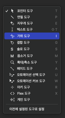 키보드로 T를 누르면 이러한 메뉴가 뜹니다. 이 때 가위 도구를 선택해주세요.