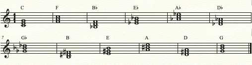 위의 코드 순서는 완전 4도 상행, 또는 완전 5도 하행으로 진행하는 순서이며 위의 순서는 코드진행에서 자주 나오는 진행이기에 4도권(5도권)순서대로 연습하고 외워보는것이 좋습니다.