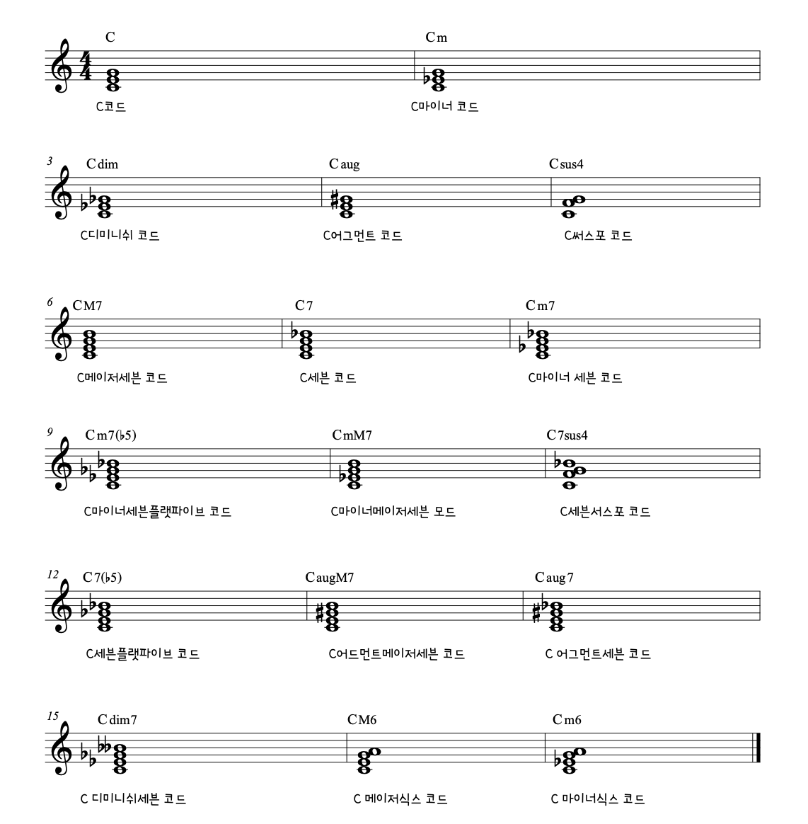 아래 악보를 보시면 C코드 Cm(C마이너) 코드처럼 생긴 것도 간단하고 읽기도 간단한 코드가 있지만 악보의 4번째 줄의 코드들처럼 C마이너세븐플랫파이브코드, C마이너메이저세븐코드와 같이 읽기에 복잡한 코드도 있습니다.